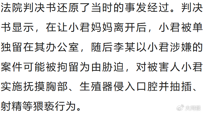 左证霞浦县东谈主民法院的判决书,2025年6月16日14时许,李某在办理小君殴打他东谈主一案中将被害东谈主偏激母亲见告到牙城派出所开发员办公室。15时许,李某借故让小君姆妈先离开,单独留小君在办公室内。