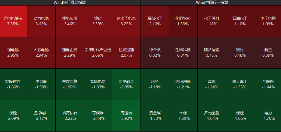 从板块看,化工板块抓续走高,锂电见识股集体走强,而电力、贵金属、多元金融等板块跌幅居前。