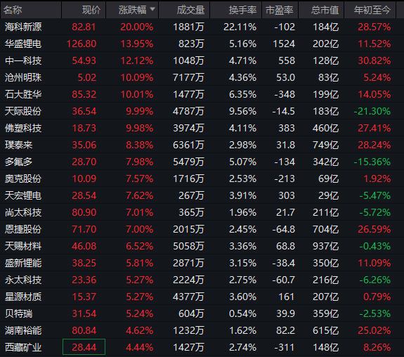 锂电见识股集体走强,锂矿、电解液、固态电板等标的发扬活跃,海科新源竣事20%涨停,融捷股份竣事3连板,沧州明珠、石大捷华、天空股份等多股涨停。